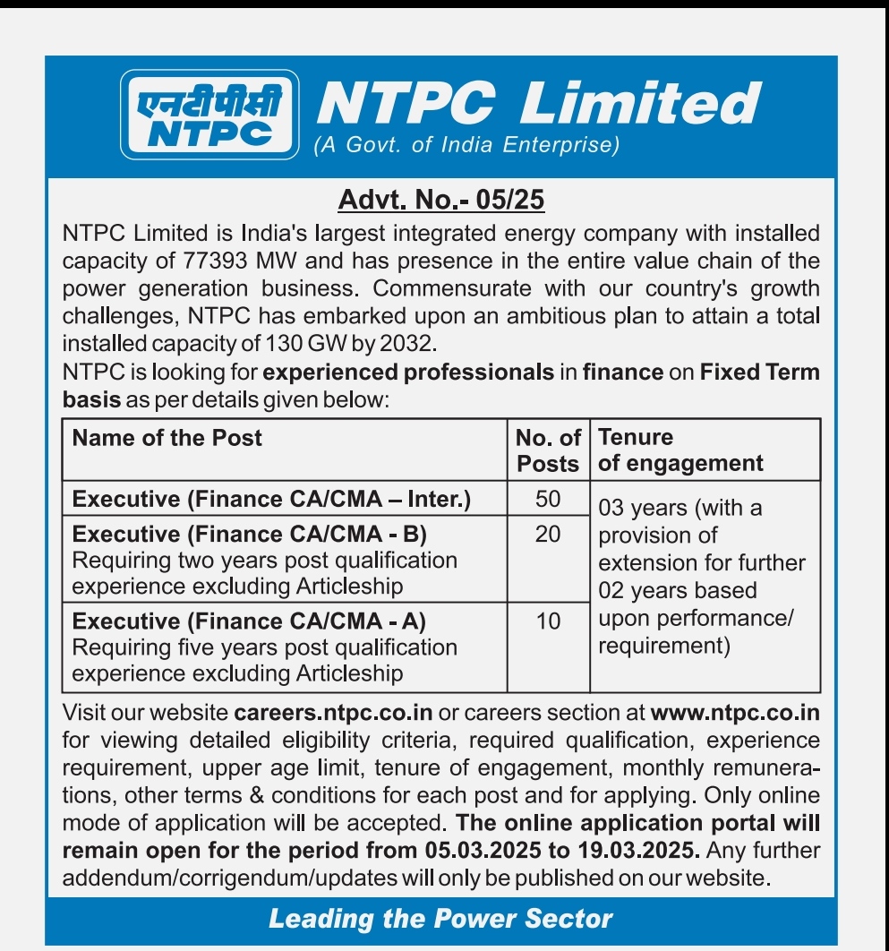National Thermal Power Corporation NTPC Recruitment 2025, Apply Online